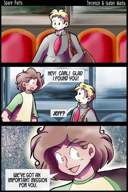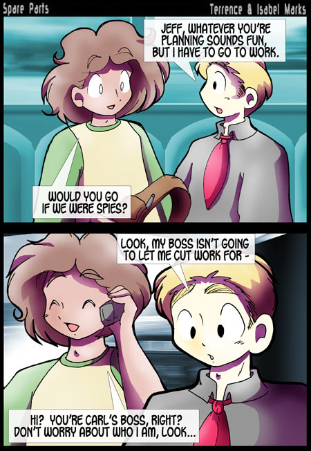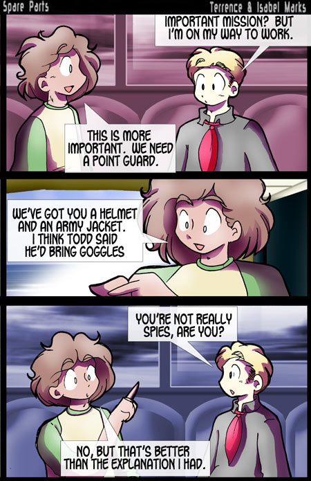 Spare Parts  is © Terrence Marks and Isabel Marks, 2003. Do not distribute any images on this site without the artist's permission or without giving credit to the comic's creators (including a link back to https://www.sparepartscomics.com/). Spare Parts has been on the web since October 2003 and updates every Monday, Wednesday  Friday at 12 AM Pacific time.