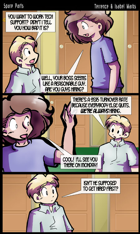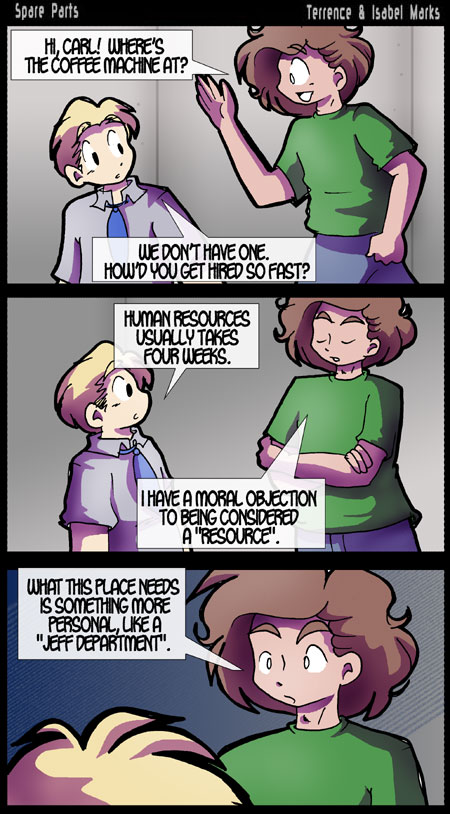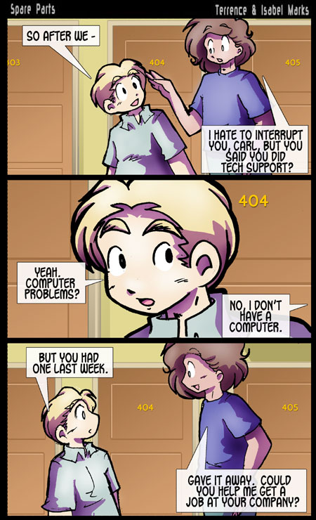Spare Parts  is © Terrence Marks and Isabel Marks, 2003. Do not distribute any images on this site without the artist's permission or without giving credit to the comic's creators (including a link back to https://www.sparepartscomics.com/). Spare Parts has been on the web since October 2003 and updates every Monday, Wednesday  Friday at 12 AM Pacific time.