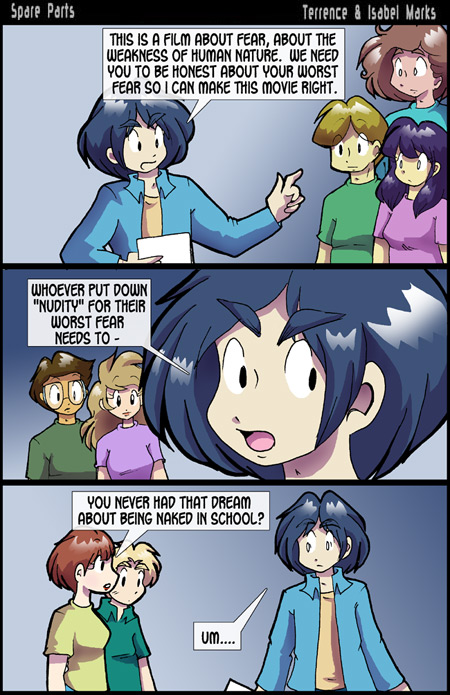 Spare Parts  is © Terrence Marks and Isabel Marks, 2003. Do not distribute any images on this site without the artist's permission or without giving credit to the comic's creators (including a link back to https://www.sparepartscomics.com/). Spare Parts has been on the web since October 2003 and updates every Monday, Wednesday  Friday at 12 AM Pacific time.