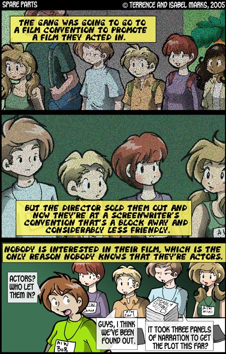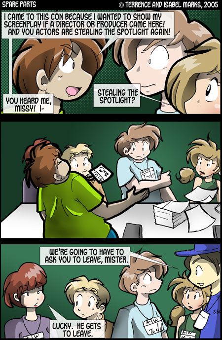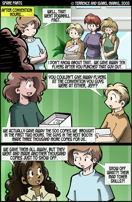 Spare Parts  is © Terrence Marks and Isabel Marks, 2003. Do not distribute any images on this site without the artist's permission or without giving credit to the comic's creators (including a link back to https://www.sparepartscomics.com/). Spare Parts has been on the web since October 2003 and updates every Monday, Wednesday  Friday at 12 AM Pacific time.