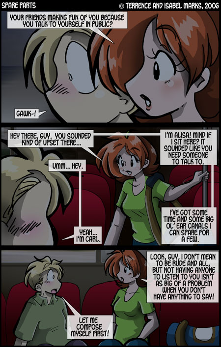 Spare Parts  is © Terrence Marks and Isabel Marks, 2003. Do not distribute any images on this site without the artist's permission or without giving credit to the comic's creators (including a link back to https://www.sparepartscomics.com/). Spare Parts has been on the web since October 2003 and updates every Monday, Wednesday  Friday at 12 AM Pacific time.
