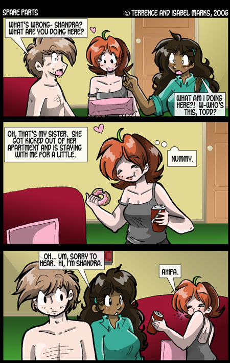 Spare Parts  is © Terrence Marks and Isabel Marks, 2003. Do not distribute any images on this site without the artist's permission or without giving credit to the comic's creators (including a link back to https://www.sparepartscomics.com/). Spare Parts has been on the web since October 2003 and updates every Monday, Wednesday  Friday at 12 AM Pacific time.
