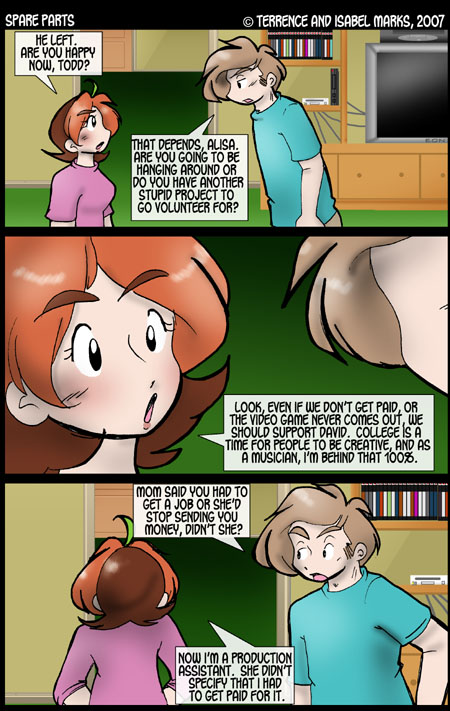 Spare Parts  is © Terrence Marks and Isabel Marks, 2003. Do not distribute any images on this site without the artist's permission or without giving credit to the comic's creators (including a link back to https://www.sparepartscomics.com/). Spare Parts has been on the web since October 2003 and updates every Monday, Wednesday  Friday at 12 AM Pacific time.