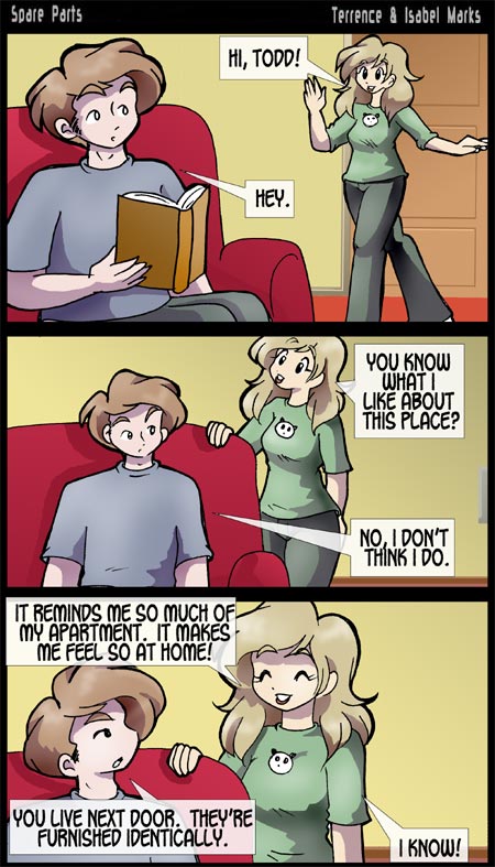 Spare Parts  is © Terrence Marks and Isabel Marks, 2003. Do not distribute any images on this site without the artist's permission or without giving credit to the comic's creators (including a link back to https://www.sparepartscomics.com/). Spare Parts has been on the web since October 2003 and updates every Monday, Wednesday  Friday at 12 AM Pacific time.