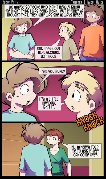 Spare Parts  is © Terrence Marks and Isabel Marks, 2003. Do not distribute any images on this site without the artist's permission or without giving credit to the comic's creators (including a link back to https://www.sparepartscomics.com/). Spare Parts has been on the web since October 2003 and updates every Monday, Wednesday  Friday at 12 AM Pacific time.