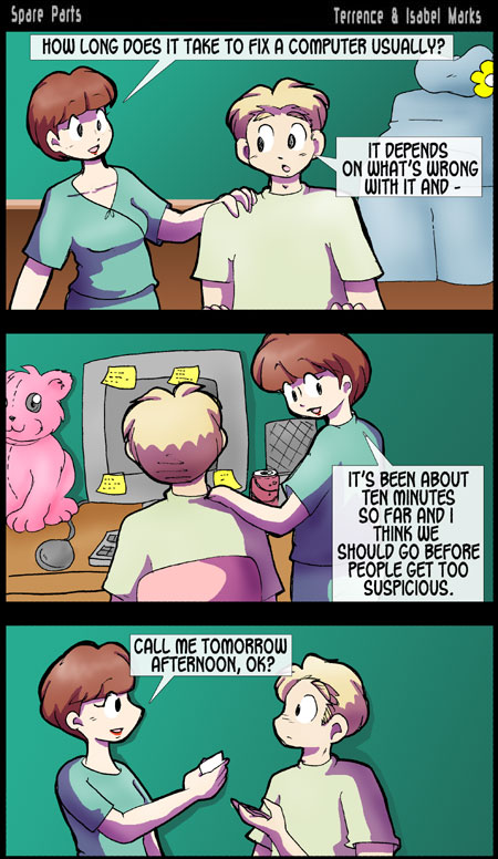 Spare Parts  is © Terrence Marks and Isabel Marks, 2003. Do not distribute any images on this site without the artist's permission or without giving credit to the comic's creators (including a link back to https://www.sparepartscomics.com/). Spare Parts has been on the web since October 2003 and updates every Monday, Wednesday  Friday at 12 AM Pacific time.